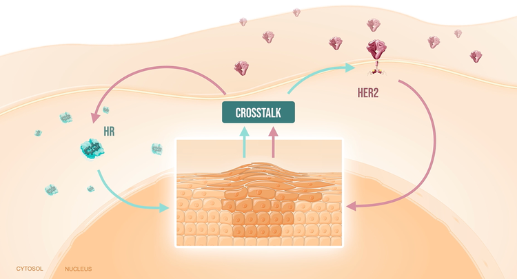 HR, particularly ER, and HER2 are the two most common drivers in breast cancer. Bidirectional crosstalk between HR and HER2 pathways can lead to continued tumor proliferation when one pathway is leveraged to compensate for the other. Therefore, crosstalk may result when both receptors are upregulated.1,2,4